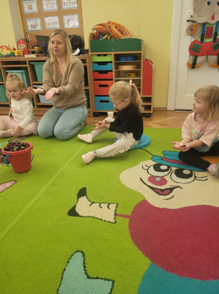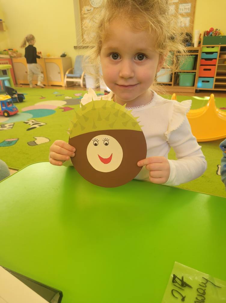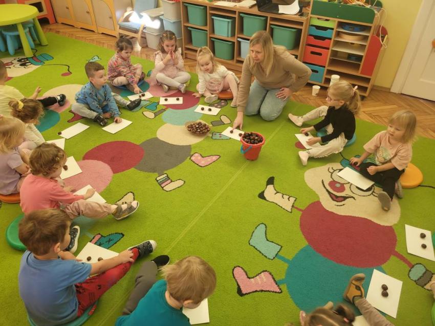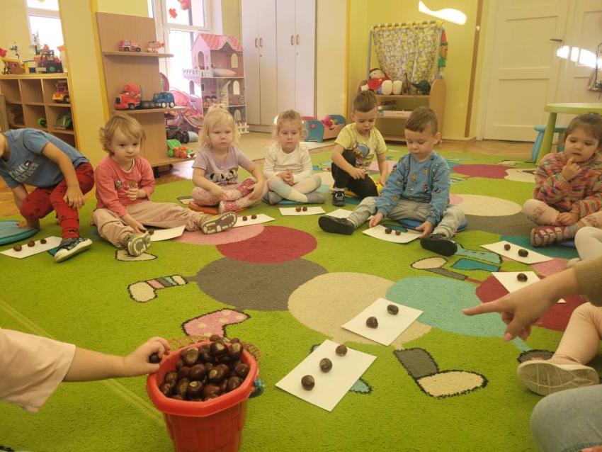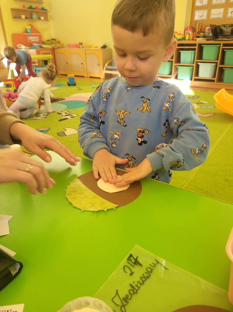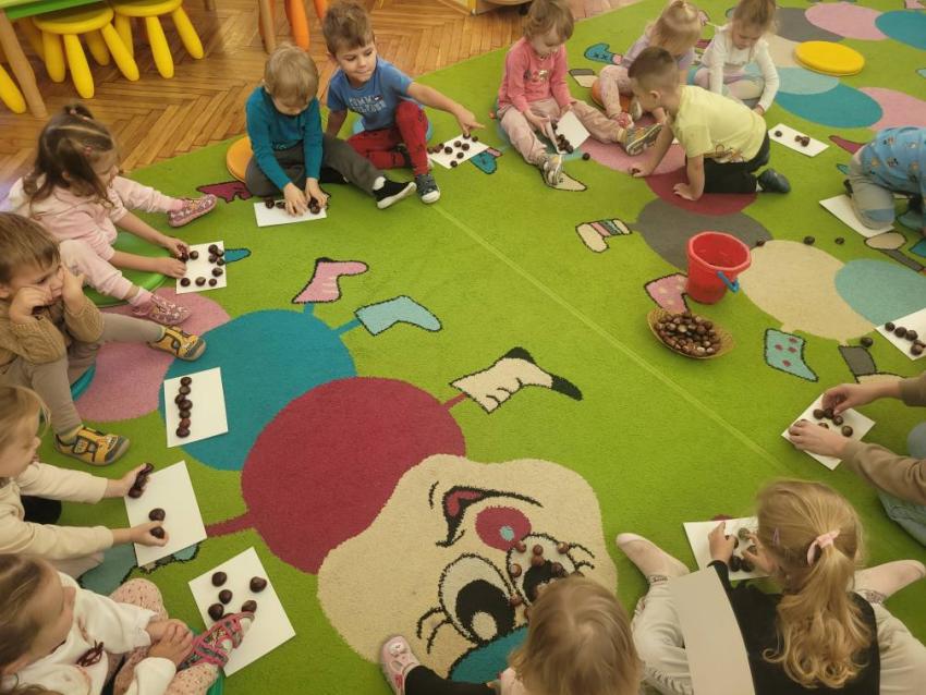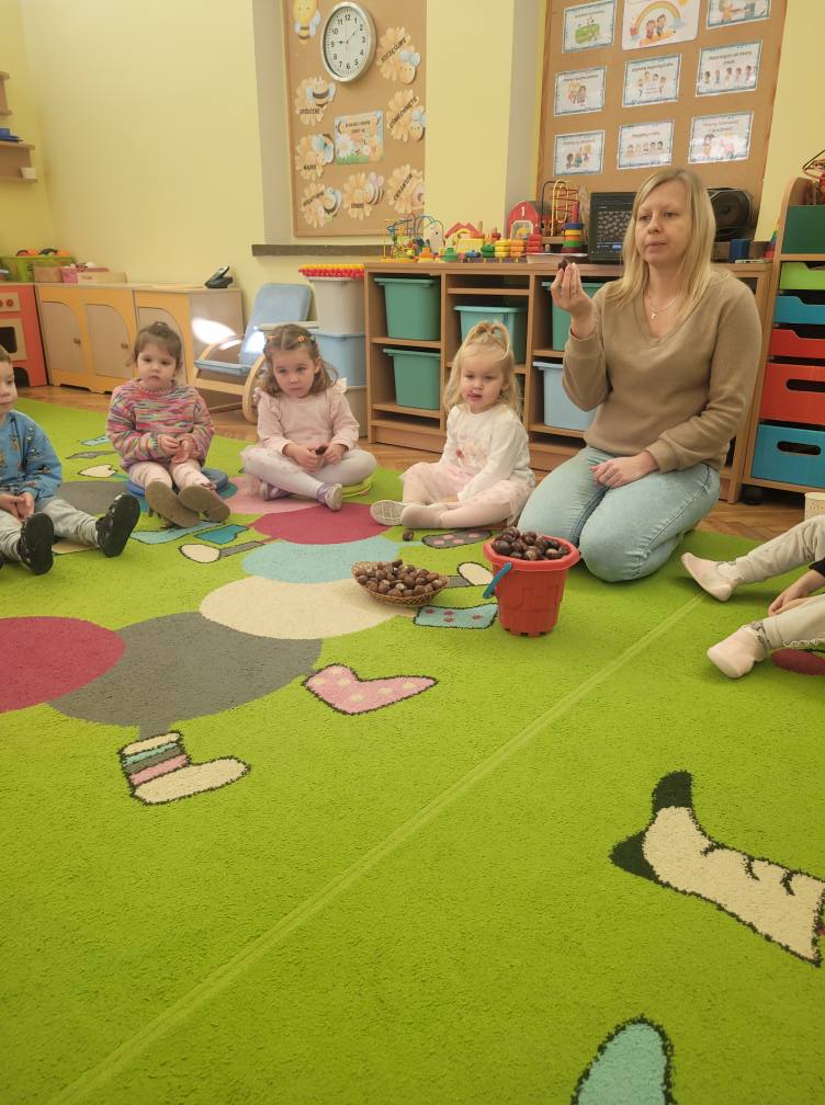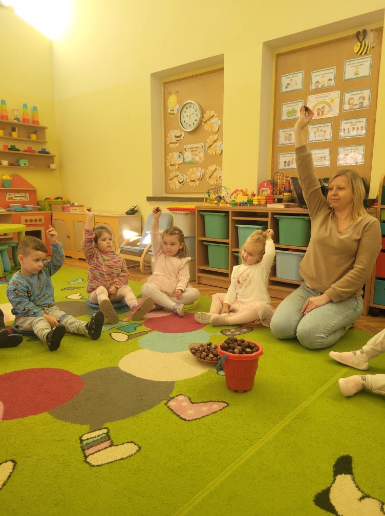 W ramach zajęć tematycznych dzieci poznawały jesienne dary przyrody . Przedszkolaki obserwowały kasztany , porównywały ich kształty i kolory. Przeliczały je oraz uczestniczyły w zabawach . Wspólnie wykonaliśmy również portret Pani Jesień .