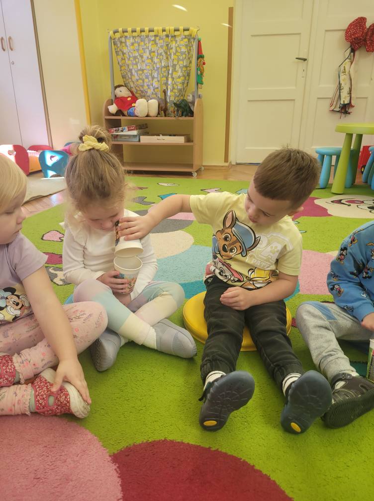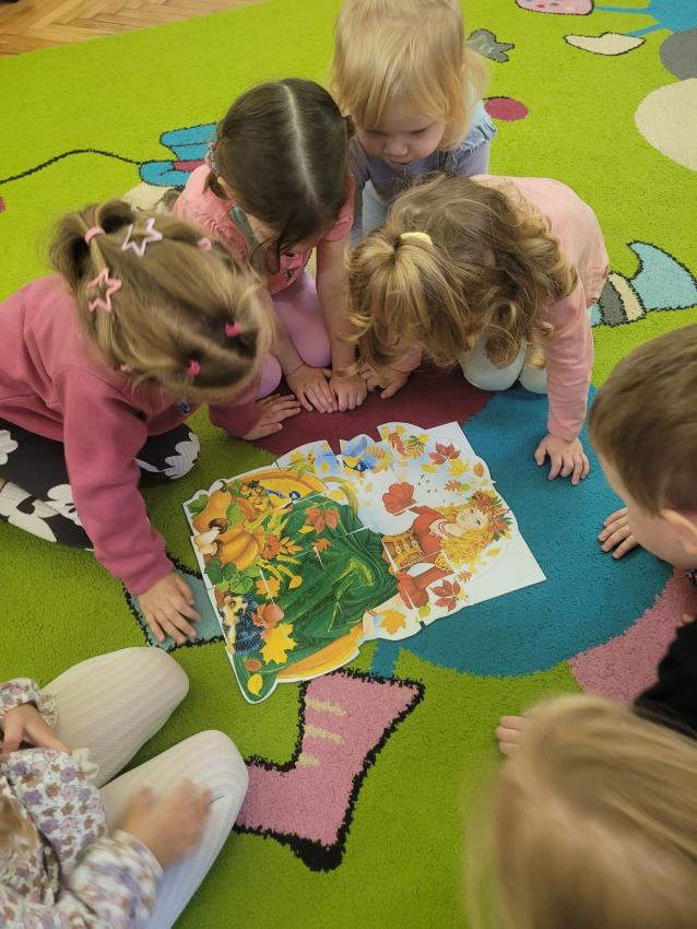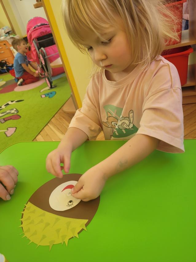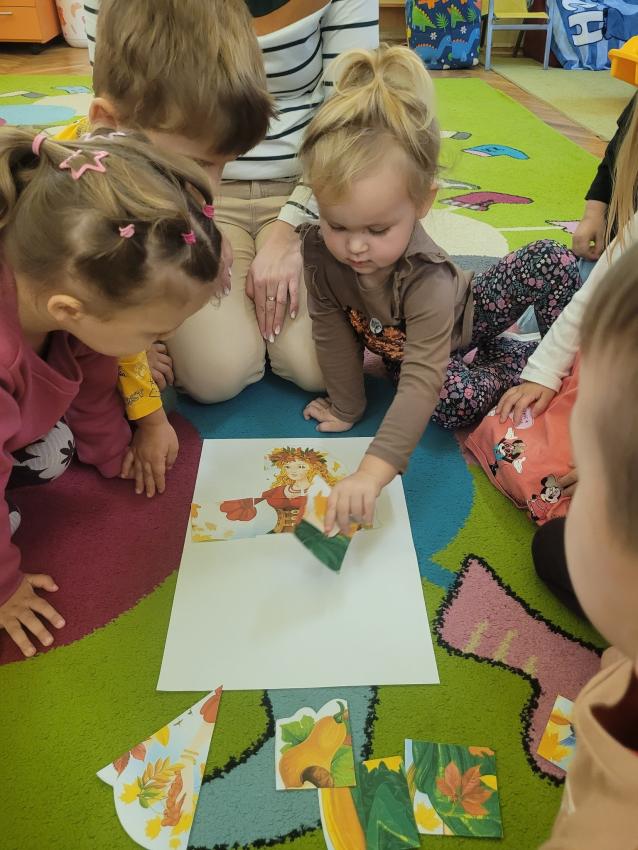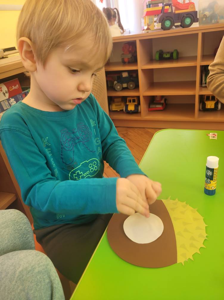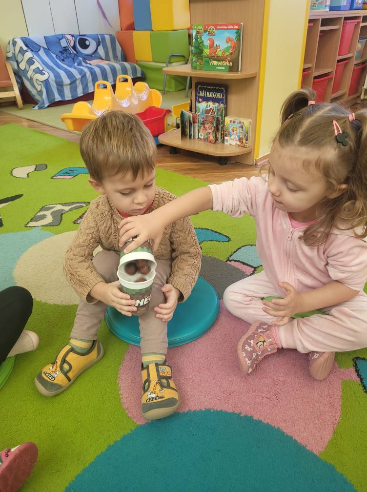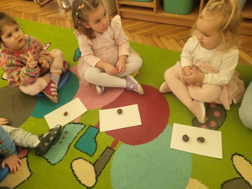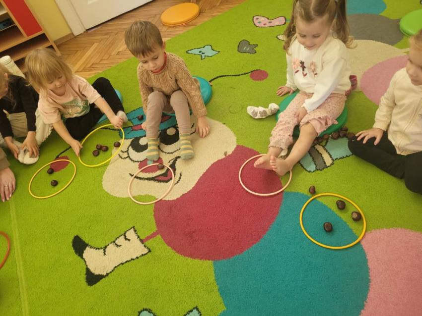 W ramach zajęć tematycznych dzieci poznawały jesienne dary przyrody . Przedszkolaki obserwowały kasztany , porównywały ich kształty i kolory. Przeliczały je oraz uczestniczyły w zabawach . Wspólnie wykonaliśmy również portret Pani Jesień .
