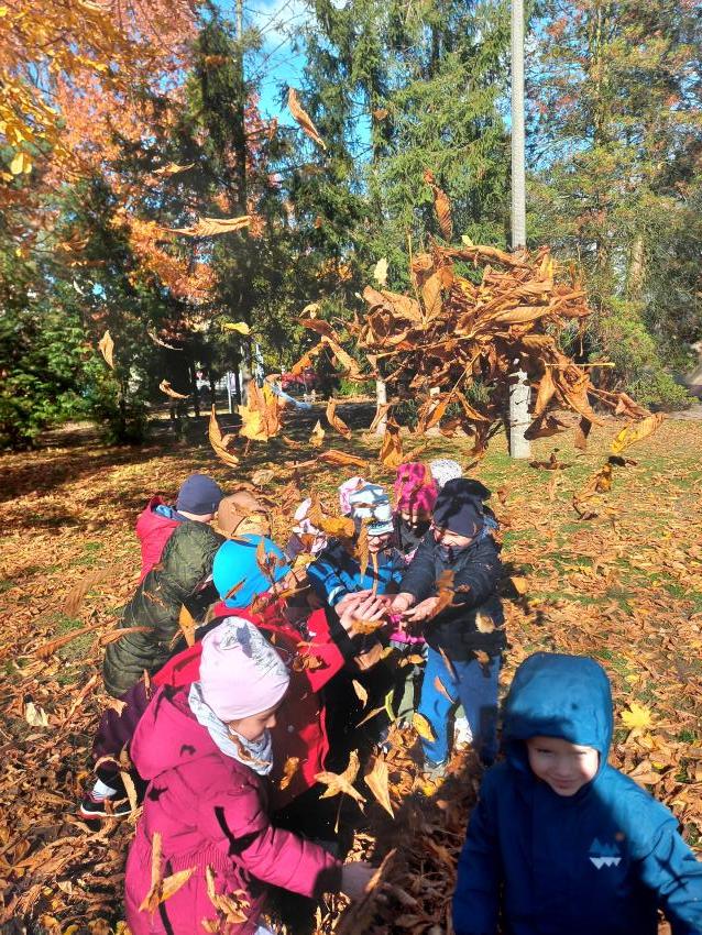 To cykl zajęć poświęconych jesieni i jej uroków. Dzieci słuchały wierszy i opowiadań dotyczących jesieni. Samodzielnie, pięknie opowiadały historyjki obrazkowe. By rozruszać dzieci zawsze towarzyszy nam zabawa ruchowa np. do piosenki /Ola i liście/w formie opowieści ruchowej, gdzie spacerowały, wirowały i zbierały rozrzucane liście. Później je przeliczały. Do pracy plastycznej zatytułowanej /Las jesienią/ wykorzystano szablony liści (imitujące drzewa). Innym pomysłem było wykonanie jesiennych witraży, gdzie na taśmie samoprzylepnej mogły naklejać listki i komponować swoje prace. W temacie jesiennym mówiono również o przygotowaniach leśnych zwierząt do zimy.