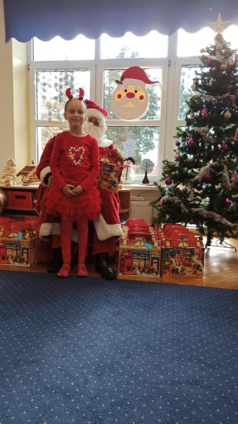 Następnie, ku naszej radości, zawitał do nas sam Święty Mikołaj! Na sali czekały na dzieci prezenty, a każdy miał okazję zrobić sobie zdjęcie z wyjątkowym gościem. Nie zabrakło także muzyki- zaśpiewaliśmy Mikołajowi piosenkę, czym wywołaliśmy na jego twarzy szeroki uśmiech.