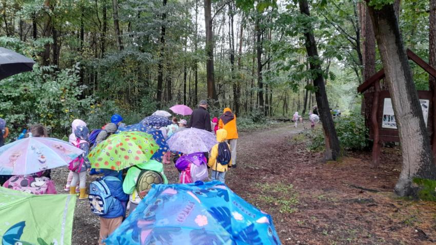 Mimo deszczu i niesprzyjającej pogody udało nam się wybrać do Wierzchosławic, aby w towarzystwie leśnika, Pana Karola Blicharza, przemierzyć ścieżkę edukacyjną i dowiedzieć się jakie zwierzęta i rośliny można napotkać spacerując po lesie. Rozmawialiśmy także o roli drzew i konieczności ochrony przyrody. Przejście całej ścieżki zajęło nam 1,5 godziny, a po tak intensywnym spacerze przyszedł czas na długo wyczekiwany piknik pod wiatą na polanie! Uśmiechnięci, zadowoleni i dotlenieni wróciliśmy bezpiecznie do przedszkola, gdzie zorganizowaliśmy sobie kolejny piknik!
