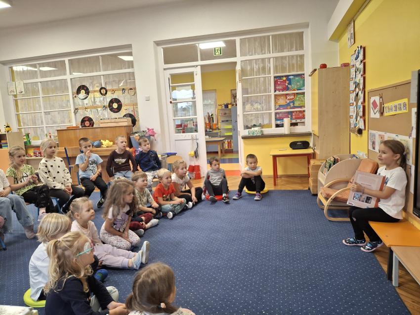 Dzisiaj każde dziecko przyniosło do przedszkola swoją ulubioną książkę, by na forum grupy opowiedzieć o niej, i o tym dlaczego jest taka wyjątkowa.