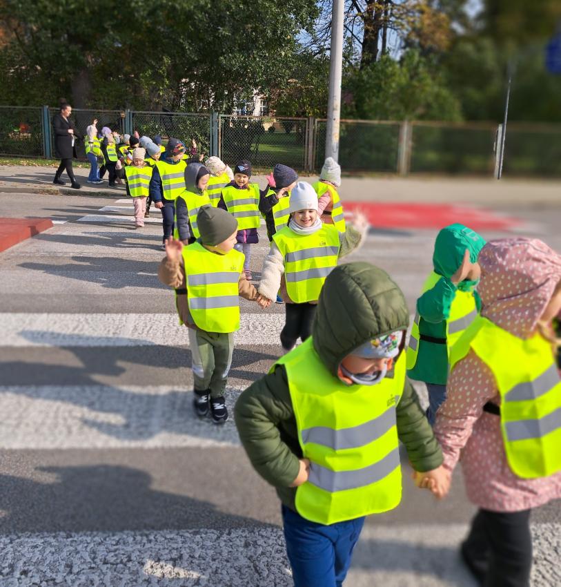 Dzieci ćwiczyły chodzenie w parach oraz bezpieczne przechodzenie przez ulicę .